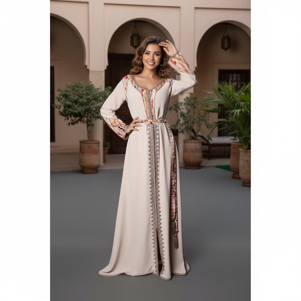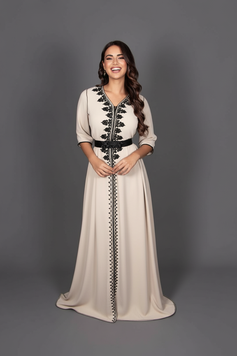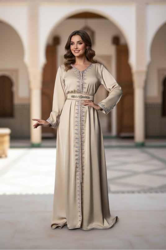 قفطان نسائي راقٍ باللون البيج، يتميز بتطريز تقليدي أنيق يضفي لمسة فخامة وأصالة على الإطلالة. تصميمه محتشم وانسيابي يناسب مختلف الأذواق، مصنوع من قماش عالي الجودة يوفر الراحة والأناقة في آنٍ واحد. مثالي للمناسبات الخاصة، الأعراس، الخطوبات، والسهرات التقليدية.