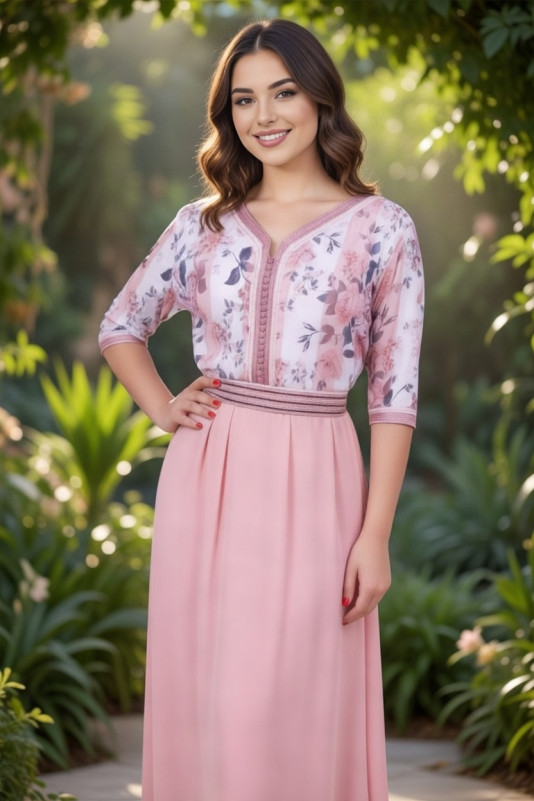 تكشيطة مغربية باللون الوردي الناعم، مزينة بتطريز دقيق في الجزء العلوي يمنحها لمسة أنثوية راقية.