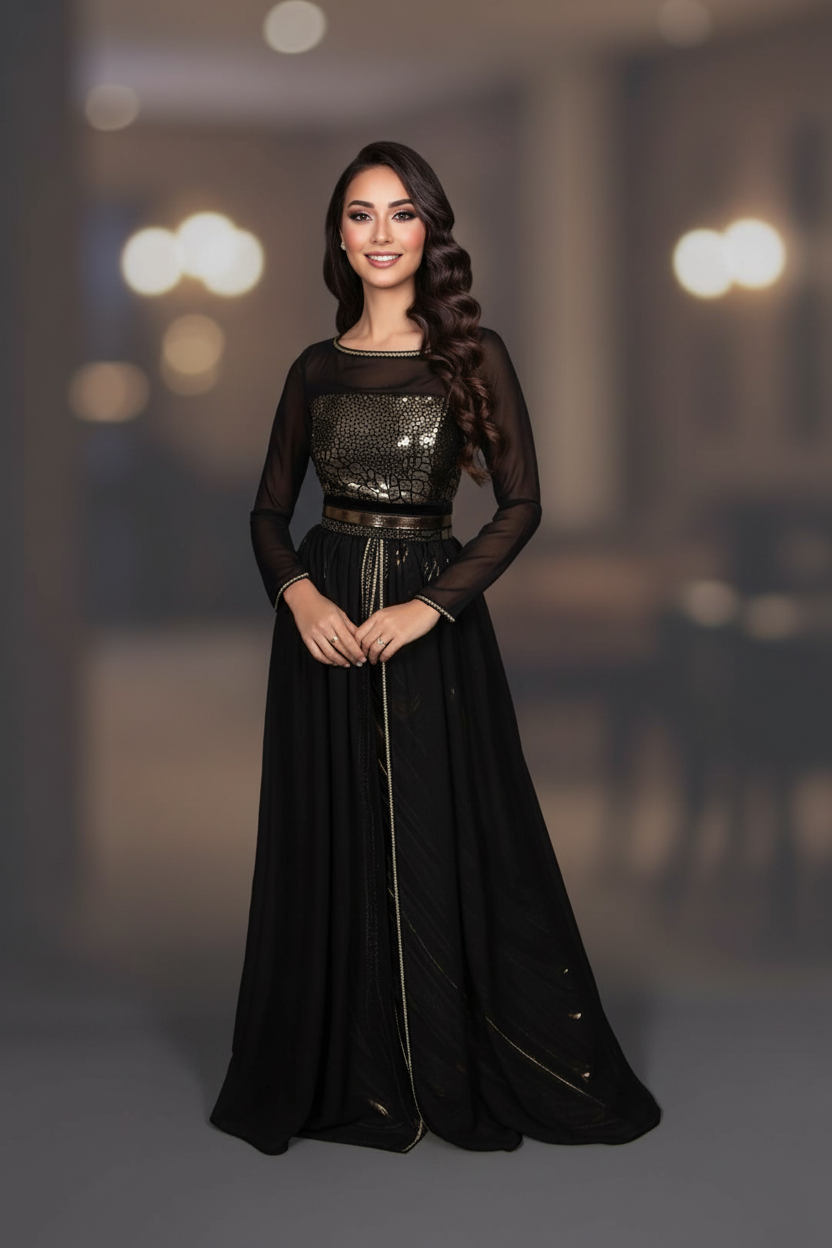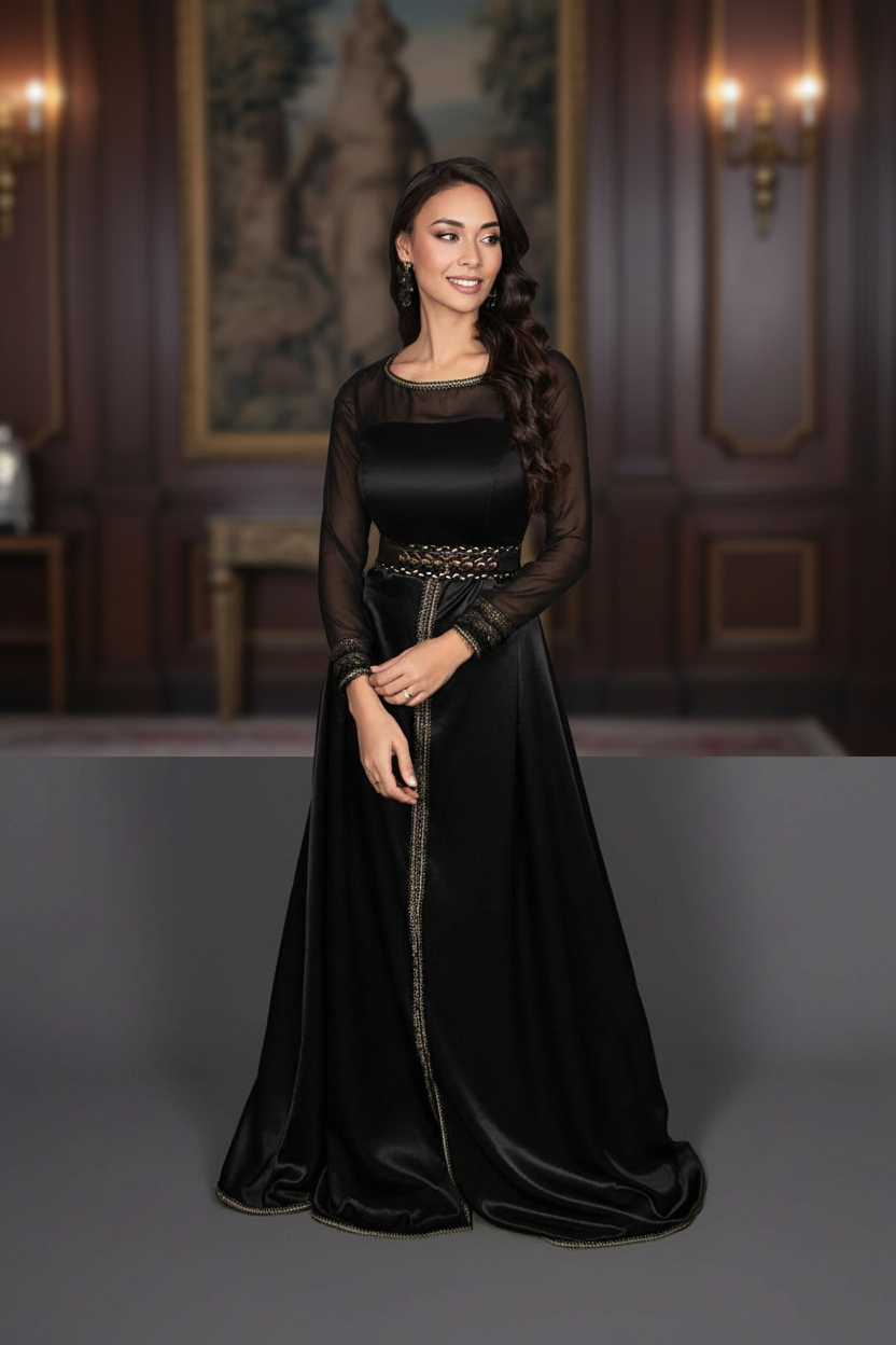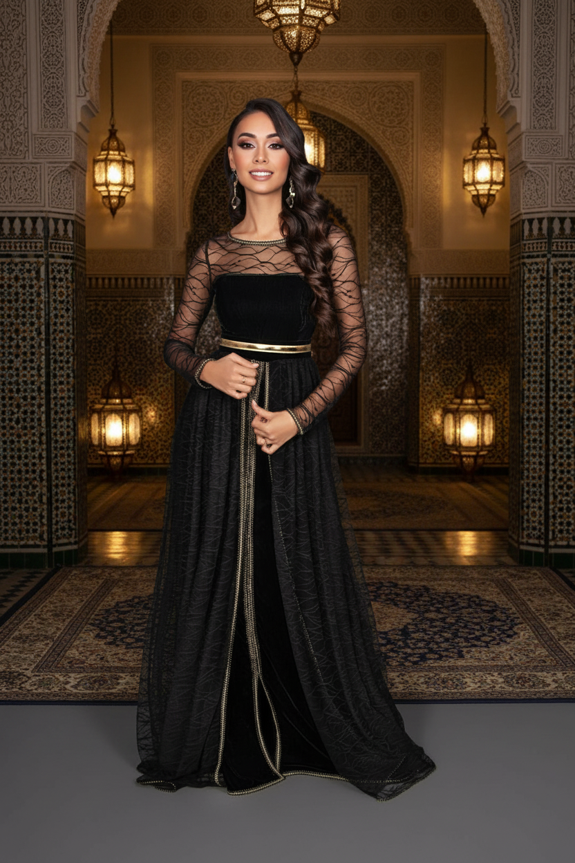 قفطان مغربي أسود راقٍ يجمع بين الفخامة والبساطة، بتصميم أنثوي أنيق وتفاصيل دقيقة تمنحك حضورًا قويًا وجذابًا.