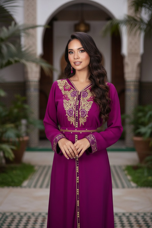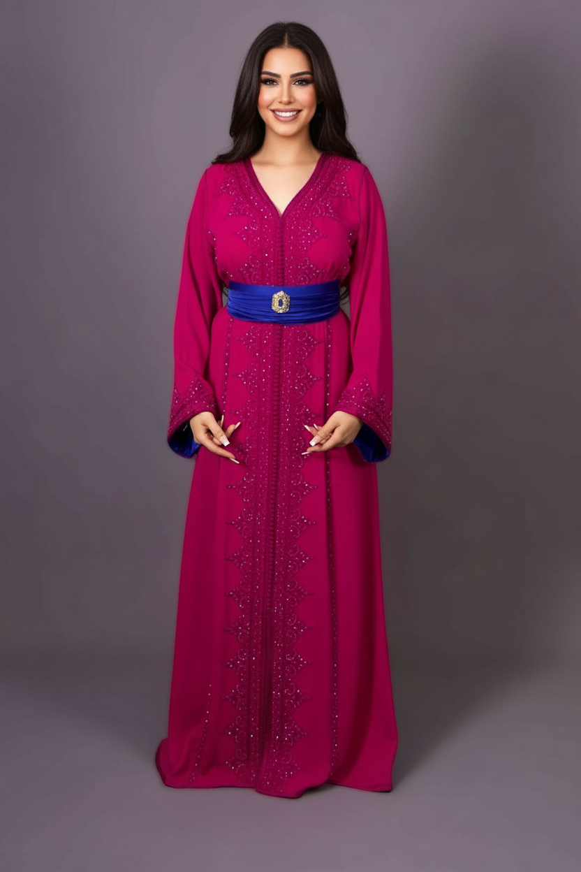 قفطان نسائي راقٍ باللون الفوشيا الجذاب، يتميز بتصميم أنيق وتطريز فاخر يبرز جمال القفطان ويمنحه لمسة فخامة وأنوثة. مصنوع من قماش عالي الجودة بانسيابية مريحة، مثالي للأعراس، الخطوبات، والسهرات الراقية. اختيار مثالي لإطلالة مميزة ولافتة للأنظار.