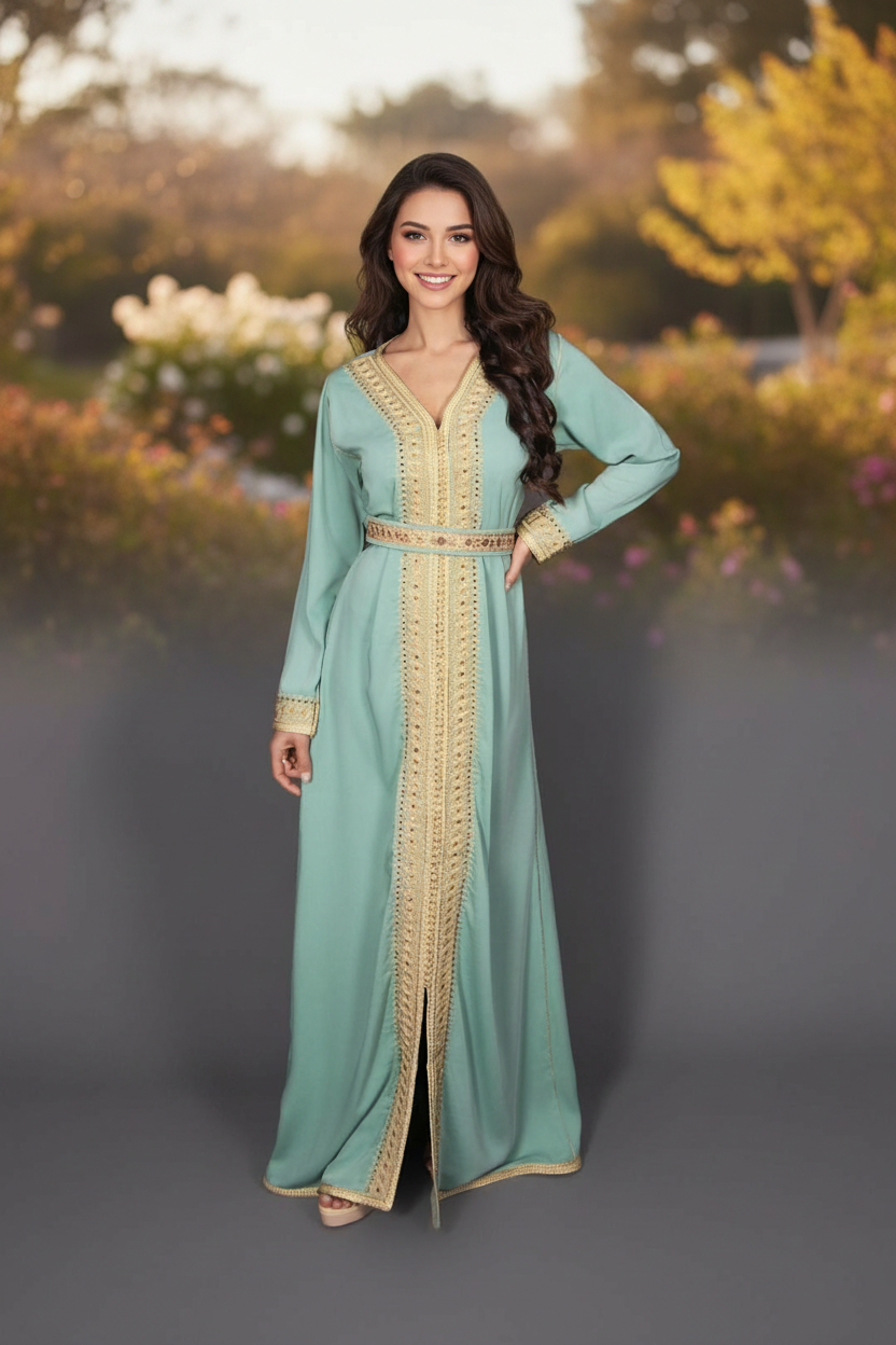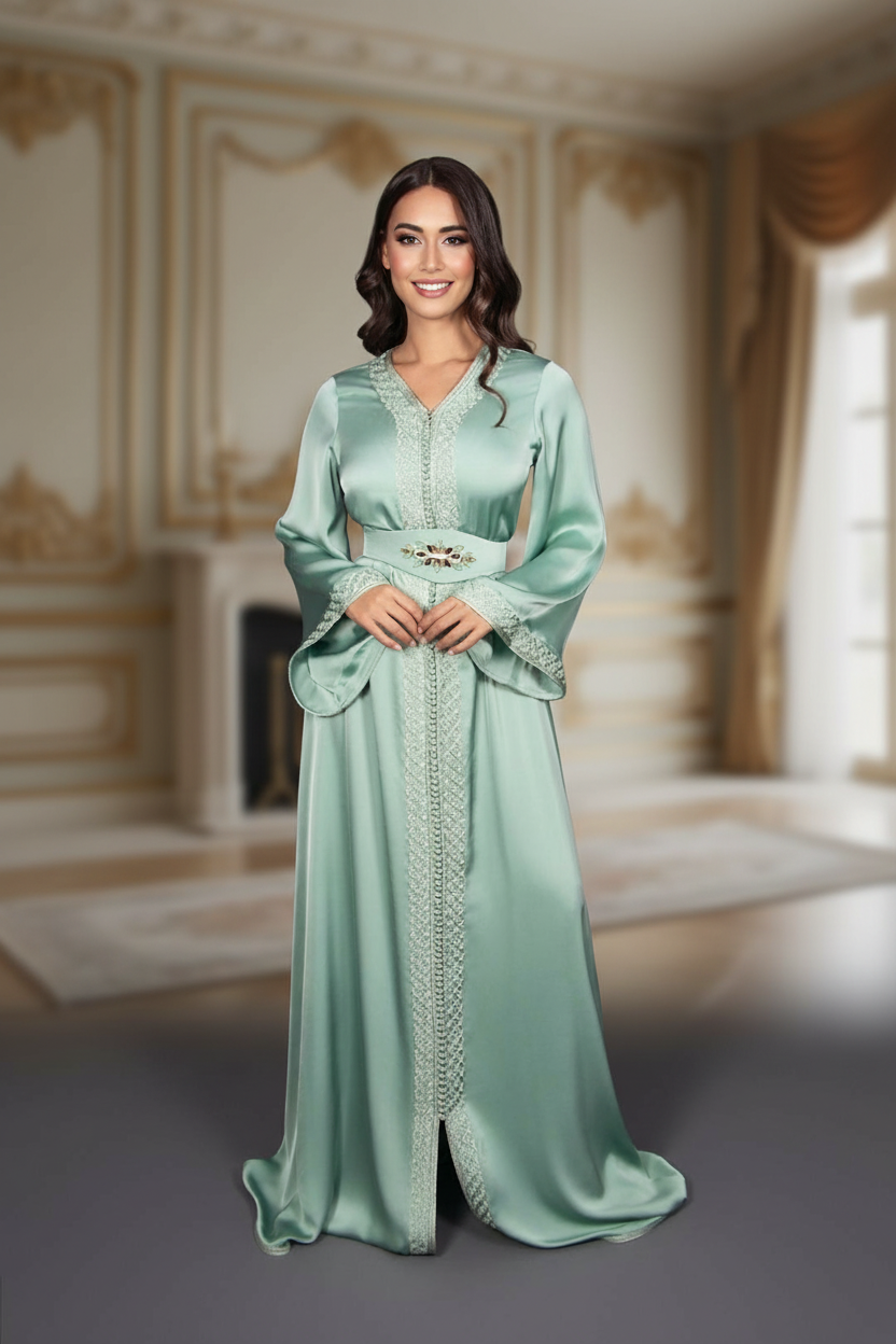 قفطان نسائي راقٍ باللون الأخضر النعناعي الهادئ، يتميز بتصميم أنيق وتطريز فاخر يضفي لمسة نعومة وفخامة على الإطلالة. مصنوع من قماش عالي الجودة بانسيابية مريحة، مثالي للأعراس، الخطوبات، والسهرات الراقية. اختيار مثالي لإطلالة أنثوية راقية تجمع بين البساطة والأناقة.